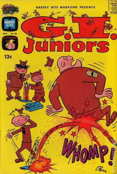 Cover by Jack O'Brien. Stories and art by Jack O'Brien and others. A showcase anthology that launched many of Harvey's long-running titles. This issue features The GI Juniors, a spin-off of George Baker's Sad Sack featuring mischievous young cadets. The GI Juniors manage to take over the base with their massive new cadet, Ape, and drive all the commanders right up the nearest telephone pole. Plus military comedy with Sarge and the Sad Sack gang. Judo Champ; Zoo's Who; Too Many Cooks; Who's In Charge Here.