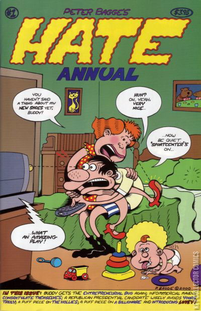 All of the best of Peter Bagge from the year 2000 all in one place! First off, there's a Buddy and Lisa yarn (yay!), picking right up from Hate #30. Then, there's an eight-page story featuring the new Bagge character, "Lovey." Add in a whole slew of "comics journalism" pieces (watch out, Joe Sacco!) done for Suck.com (R.I.P.) and presented in print here for the very first time — on such subjects as the Infomercial Oscars, hopeless presidential hopeful Alan Keyes, and the Seattle Experience Music Project, all skewered with Bagge's trademark wit — plus such odds and ends as a three-page "Matrix" story, and you've got 48 pages of never-before-printed full-color Bagge for a great price!
