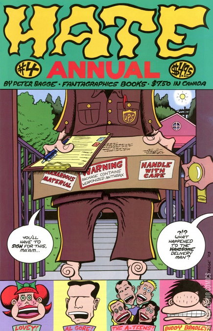 Buddy gets fed up with the ups and down of being an entrepreneur and decides to opt for the security of a corporate job: driving a delivery truck! Also, Bagge's reporting from both the 2000 Democratic and "Reform" party's respective conventions. Also, an embarrassingly honest appreciation of contemporary teen pop music, as well as a back-up story featuring Lovey.