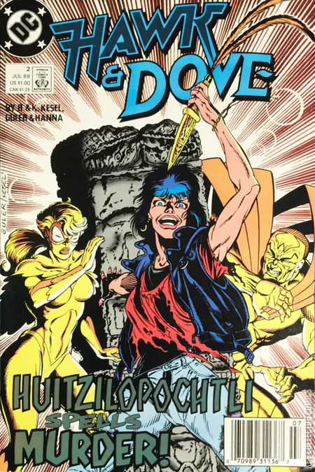An imitation Mexican brooch transforms a street urchin into a vengeful Aztec goddess, creating insurmountable problems for Hawk, Dove and Dove's mother.