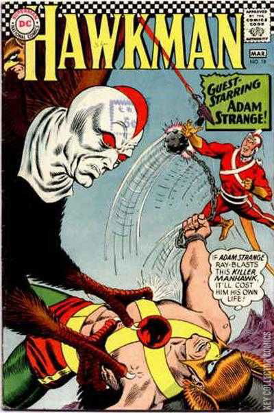 While Hawkgirl is on Thanagar, Hawkman is surprised by an emergency hyper-space call from her, warning of the escape of the Manhawks, who now threaten their world. When Katar heads home, he finds his planet missing from its normal spacial position. Meantime, on Rann, Sardath has finally found a means to keep Adam Strange on the planet, while eliminating the radiation that Kanjar Ro had placed in his body which meant death if he stayed on Rann more than a year, and with the side-effect of causing death if he returned to Earth. A sub-nucleonetic machine now prevents the Zeta-Beam radiation from wearing off Adam's body, and he is now free to marry Alanna. In the middle of their marriage ceremony, the Manhawks attack Rann, and Adam must lead the planet's warriors into battle. Just as he is about to be blasted by an enemy, Hawkman arrives to save him, taking a blast which unfortunately destroys the Absorbascon. As the Manhawks make Rann's science buildings vanish, Katar explains how to disarm them of their masks. The two adventurers track the Manhawks to the Gorge of Chrystar, where the buildings are kept, and, capturing an enemy, use the Veracikon (a lie detector) on him to discover the plans. Radiation from an unknown source had given the Man-hawks super-strength while in their prison, and after their escape they easily shifted the planet to a new spacial position. When the powers waned, the Manhawks tracked the radiation to Rann, where, unknown to them, Sardath's sub-nucleonetic machine was creating it. Hawkman and Adam Strange return to Ranagar to defend the machine, knowing that its theft will shift Adam back to Earth and instant death. To prevent this, Hawkman takes a duplicate of it to Earth, and there the Manhawks die in Adam's place. He returns to Rann, resolved to find his wife and their planet.
