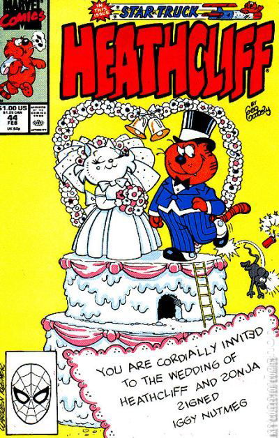 Comic book version of the popular comic strip cat, Heathcliff. In this issue, Heathcliff and Sonja decide to get married and go all out with the wedding plans and parties. And when the day arrives for the wedding, will Heathcliff get cold feet? Find out in "The More The Marry-er." Script by Angelo DeCesare and art by Warren Kremer & Jacqueline Roettcher. Then in "Star Truck," Heathcliff dreams that he and the gang are out in space aboard the good ship Star Truck. Script by Angelo DeCesare and art by Warren Kremer & Roberta Edelman