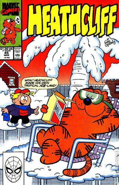 Comic book version of the popular comic strip cat, Heathcliff. In this issue, Heathcliff tries to help out a musician who gets things thrown at him whenever he plays his bagpipes in "The Pied Piper of Westfinster." Script by Laura Hitchcock and art by Howard Post & Roberta Edelman. Then in "Never Say Diet," Heathcliff is miserable when the vet puts him on a new and strict diet. Script by Trusiani and art by Warren Kremer. Issue also has a Top Dog story "He's No Man" in which Top Dog tries to help Joey with his so-so skating skills when Ice Party America is coming to Warrenville. Script by Angelo DeCesare and art by Warren Kremer & Roberta Edelman.