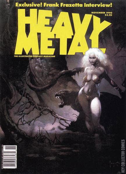 Vol. 14 No. 5 Frazetta cover and interview, November 1990, issue 129. Dubbed "The adult illustrated fantasy magazine," Heavy Metal also publishes tales of horror, science fiction, and adventure. This issue includes the following stories: Dieter Lumpen: Enemies in Common by Ruben and Zentner; The Time Zuck Company by Zeliko Pahek; Semel Insanivimus Omnes AKA The Prisoner by Angus McKie; Bonnie & Clyde by Rebecca Fletcher and Tim Fletcher; Modern World by Peter Kuper; and Behind the Cursed Curtain by Rick Geary. Includes interview with Frank Frazetta. Cover art by Frazetta. Cover price $3.95.