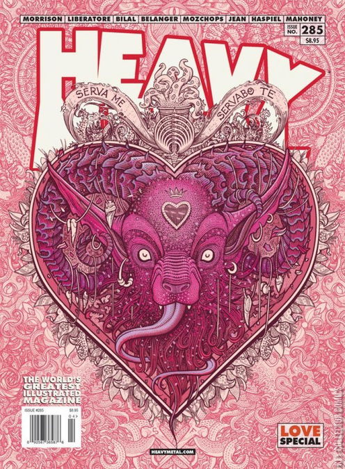 Grant Morrison spreads the love as Editor-in-Chief in Heavy Metal's issue #285! Morrison contributes a new story a new story of two unlikely friends called "Bowie & Burroughs," as well as his usual themed insightful short story style editorial. Part two of Eniki Bilal's ongoing story takes flight as well as the second to last installment of Salsa Invertebraxa by Mozchops and Zentropa by John Mahoney. A new story by Latin artist Fernando Baldo. With new content from Dean Haspiel, Alex De Campi, Carla Speed McNeil and many, many more. Cover A is by Mondo screen print king, Florian Bertmer. Cover B is by European science fiction painter, Peter Gric. Titallating Cover C by James Jean.