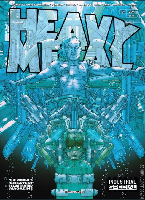 Heavy Metal Magazine #294 - The Industrial Special features more than a dozen stories of technology and man at conflict. Publisher, Kevin Eastman, makes is second writing outing in Heavy Metal with artists Esau & Isaac Escoza (Taarna) in this techno romance, "Dance, Death, Dance." Industrial band, MINISTRY. Makes their debut in Heavy Metal with an adaptation of their song "Theives" by Aubrey Sitterson with art by Andrea Mutti."IF/THEN" by Genevieve Valentine with art by Augustin Alessio shows how a kind heart can change cold circuitry. "1NF3RN0" by Curt Pires & Thom London with art by Antonio Fuso shows a future where religion is dictated by giant machines, who make mistakes more often than they like to admit. "Caretaker" by Matt Emmons is a story about the Earth's stewards after the time of man. "Into The Black" is a Bladerunner style graphic novelette by newcomers Keith Grassmick and Nick Philpott with colors by Dennis Calero. Dwayne Harris delivers a short but sweet tale of hilarious misfortune in the digital age with "Glitch". Michael Dupless, Frank Forte and MoraMike's"Machine Age Voodoo" shows the dangers of man and machine on the edge of war. Homero Riosand Davi Agusto examine Robot's dealing with civilization. Newcomer Jesse Lonergan showcases a metamorph hitmn on forgotten worlds looking for his place amongsrt them. Heavy Metal legend, Philippe Caza returns with "Planet Carnivore". Continuing is this issue are chapter four of Grant Morrison & Gerhard's "Smile of the Absent Cat", Chapter 8 of Richard Corben's "Murky World. The three art galleries feature works by phenom artist, Nick Pyle, Xsullo, and cover artist, Donato Giancola