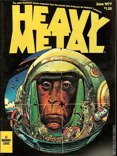 Rich Corben, Moebius, & Bode art 6/77, issue 3. Dubbed "The adult illustrated fantasy magazine," Heavy Metal also publishes tales of horror, science fiction, and adventure. This third issue includes the following stories: Gail by Druillet; World Apart by Ed Davis; Conquering Armies by Gal and Dionnet; Vessel by Hé; Sunpot by Vaughn Bodé; Rockblitz by Macedo; Night Images by Robert E. Howard; Sloane by Tardi; Age of Ages by Rubington; 1996 by Montellier; Harzak by Moebius; Vengeance by Alexis; and Shells by Schuiten. Cover art by Moebius. Cover price $1.50.