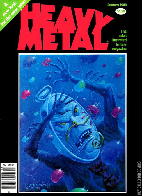 The adult illustrated fantasy magazine. Cover art by Don Ivan Punchatz. Michael William Kaluta contents page and intro art. The Story of Rowlf, script and art by Richard Corben. The Pause That Refreshes, script and art by Val Mayerik. Womb with a View, script and art by Dan Steffan. Exit/In, script and art by Neal McPheeters. Paradise Lost, script by John Milto and Terrance Lindall (adaptation), art by Terrance Lindall. Space Race 3000--Stellar Journals, script and art by Karl B. Kofoed. Zooks!, script and art by Vaughn Bode. The Swords of Heaven, the Flowers of Hell--Gallery Section: New Books, script and art by Howard Chaykin. Food for the Children, script and art by Arthur Suydam. Alien Comix Presents, script and art by Rick Veitch. Shoot Out at the Fantasy Factory, script by Trey Aven, art by Stephen Hill. Hive, script and art by Paul Kirchner. Jan, 1980, issue 34. 100 pgs. Cover price $1.50. Cover price $1.50.