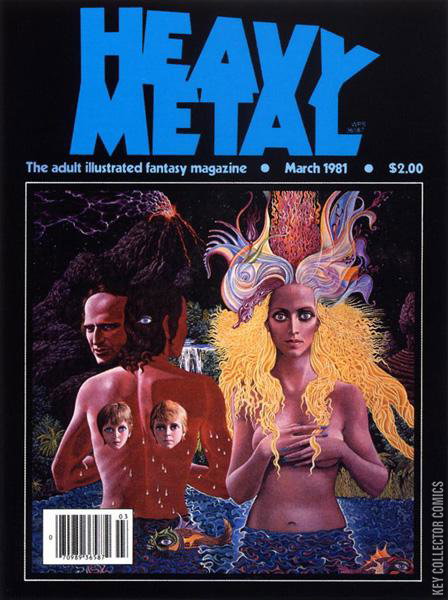 AThe adult illustrated fantasy magazine. Cover art by Abdul Mati Klarwein. Bloodstar, script by Robert E. Howard, John Jakes (adaptation), and John Pocsik (adaptation), art by Richard Corben. What Is Reality, Papa?, script by Christian Godard, art by Julio Ribera. Edward In Love, script and art by Dominique He. Red, script and art by Matt Howarth. Fear Not Your Enemies article by Harlan Ellison. Salammbo, script and art by Philippe Druillet. The Ambassador of the Shadows featuring Valerian: Time-Space Agent, script by Pierre Christin, art by J. C. Mezieres. Tex Arcana, script and art by John Findley. The Man with the Suitcase, script and art by Jean Teule. Milady 3000: The Prince of Equilibrium and a Serene Galaxy, script and art by Roberto Raviola [as Magnus]. Rock Opera, script and art by Rod Kierkegaard, Jr. March, 1981, issue 48. 100 pgs. Cover price $2.00. Cover price $2.00.