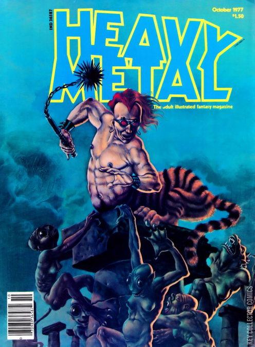 Rich Corben and Moebius art October 1977, issue 7. Dubbed "The adult illustrated fantasy magazine," Heavy Metal also publishes tales of horror, science fiction, and adventure. This seventh issue includes the following stories: The Garage by Moebius; How Good is Man? by Moebius; The Singsong of Cecily Snow by Theodore Sturgeon; Jet Man by McKie; Turod by Risilio; Den by Richard Corben; Operation Omega by Leblanc and Lire; In You I Am Reborn by Dionnet and Solé; The White Night by Zha and Claveloux; and Polonius by Tardi. Cover by Nicollet. Back cover by Berni Wrightston. Cover price $1.50.