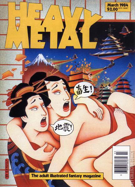 Vol. 7 No. 12 The adult illustrated fantasy magazine. Cover art by Andy Lackow. Japanimation article. Hi-Tech Lowdown article, script and art by John Holmstrom. Wurtham View 2000, script and art by Angus McKie. I'm Age, script and art by Jeff Jones (one page). Meets the Toast of Europe starring Tex Arcana, script and art by John Findley. Through the Muck and Mire featuring The Third Incal, script by Alexandro Jodorowsky, art by Jean Giraud (as Moebius). Forbidden Passions, script and art by Nicola Cuti (one page). Salammbo II: Carthage, script and art by Philippe Druillet. Bob Hope's 100th Birthday by Drew Friedman. Douglas Adams interview. Ranxerox in New York, script by Stefano Tamburini, art by Gaetano Liberatore. If You're My Sweet, I'm on a Diet, script and art by Mitch O'Connell. Valentina the Pirate, script and art by Guido Crepax. Living in the Ice-Age starring El Borbah, script and art by Charles Burns. Rock Opera, script and art by Rod Kierkegaard, Jr. March, 1984, issue 84. 100 pgs. Cover price $2.00. Cover price $2.00.