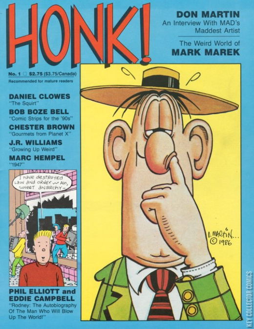 Original Comics: Cartoon Man by Marc Hempel The Gourmets from Planet X by Chester Brown Grape Jam by Gary Whitney Temptation by Glenn Dakin Laffin' Yups by J. R. Williams Growing Up Weird by J. R. Williams A Tale from Gimbley by Phil Elliot Look Out it's the Squirt by Mort Todd and Daniel Clowes True Humor by Eddie Campbell The Graphic Genius of M.C. Escher by David Miller Rodney: The Premonition II by Phil Elliot and Eddie Campbell 1947 by Marc Hempel My Mother's an Alchoholic by Brian James Riedel Feature Articles: The Mad World of Don Martin: an interview with MAD's Maddest Artist by Mark Waid Mark Marek: An interview with Mark Marek Reviews: The Honk staff dissect an odd assortment of supposed humor books.
