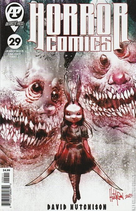 'Jabberwock, Part 3' Continues 'Jabberwock' pts 1 & 2 from Horror Comics #9 & #19 Teether creator David Hutchison takes us through the looking glass once more. Our delicate yet grim heroine, a girl with a cursed mask and some very big knives, encounters double trouble in the massive shapes of Tweedle Dee and Tweedle Dum. Who will survive, and what will be left of them?