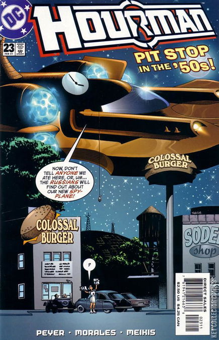 Hourman’s journey through the timestream with his friends is underway. Snapper Carr discovers one of the goals of this trip, to use up what’s left of the Timeship’s juice to travel through time, as the party enters the year 1954. The crew land for a bathroom break, and are accosted by Roy Munson, the police chief of Happy Harbor in 1954. When Munson tries to arrest Hourman, current chief Andrea Lee quickly drops him, using her martial arts skills. The group decides to leave quickly, before they run into more trouble. After back into the timestream, Hourman's girlfriend Bethany Lee coerces Hourman to show them her future. Hourman brings the timeship into the future. However, instead of seeing Bethany together with Hourman, they find her future self together with Gary...