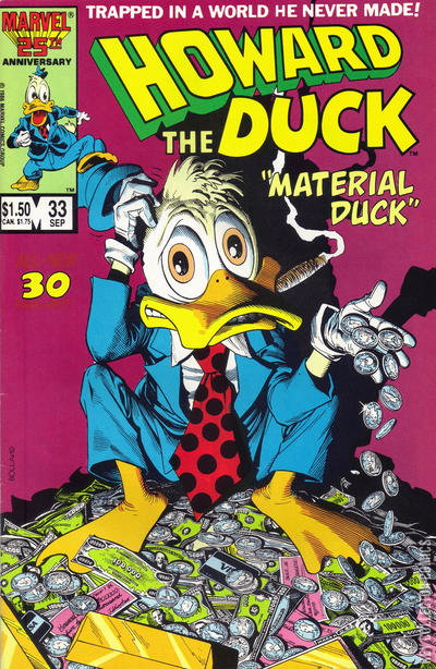 Howard has finally hit the jackpot, winning a million dollars from a publishing sweepstakes! With the fame and fortune, Howard is a changed man and not for the better. Beverly doesn’t agree with the new Howard the Duck and leaves him once again. Will Howard the Duck ever be loved again?Howard wins 10 million dollars in a contest and switches lifestyles. From a perpetually broke drifter to a businessman with his own mansion. Beverly briefly returns to his life, only to find him changed for the worse. Still cynical to the core, but also self-absorved, demanding and verbally abusive. She leaves him without a second though.A lonely Howard pays medical genious Dr. Dwight Clive to create a female companion for him. Promising to sing off his entire fortune to Clive in case of a success. The results are underwhelming. Clive used cell samples from Howard and a beautiful French-Canadian woman to create an attractive feminine duck. But could not wait for her brain to naturally develop. He resolved to transplant the brain of a recently deceased woman to the new body. Enter: Alexis the Duck.The recently deceased woman was the spoiled, overindulgent wife of a wealthy lawyer. Alexis inherited her character traits. A constant desire for flashy, material posessions, a poor grasp of maths, and a need to constantly spend more. She financially bandkrupts both Howard and Clive. The issue ends with Howard hiking his way back to Cleveland, Alexis seducing her next victim, and Clive becoming an alcoholic.