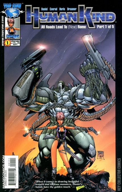 Conspiracy, androids, hot chicks on motorcycles, and monstrous alien abominations run amok in the first issue of this great new ongoing series! Detective Alia Sparrow leads the Human Crimes Bureau on the planet Thera, a planet that steals its culture and patterns itself after Earth. With the help of her hulking robotic sidekick, Greta the Enforcer, Sparrow investigates the disappearances of several human slaves, and begins to unravel the mystery of a downed space shuttle from Earth…and the conspiracy surrounding its crew.