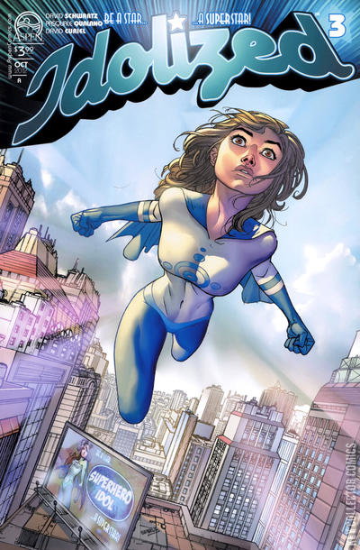 Joule's been kicked out of the IDOLIZED competition! As she desperately attempts to find a way back in-- if she does, will she be able to even survive the competition? IDOLIZED kicks into high gear, as Joule faces off against the Top Ten finalists, the show's producers, and her own seething cauldron of emotions, all in order to keep her desperate quest for revenge alive! Written and created by David Schwartz, with gorgeous art by Pasquale Qualano and David Curiel, and featuring a cover by Micah Gunnell, plus a photo cover starring supermodel Rachel Clark, you won't want to miss out on this innovative new series from Aspen Comics!
