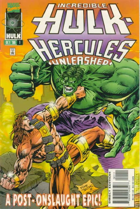 In the aftermath of Onslaught, Hercules wants to know what happened to the various heroes who were his friends. He seeks out the Hulk, the only Onslaught suvivor, but predictably, the Hulk is not in a good mood!