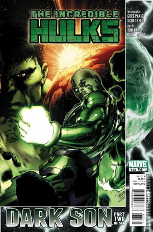 Dark Son, Part 2. So many Hulks, one book a month wasn't enough to hold them! Bruce Banner is the Hulk once again, and far from being left alone, he's got a whole family of gamma-charged allies at his side. Son Skaar, daughter Lyra, cousin She-Hulk, friends A-Bomb and Korg, and wife Red She-Hulk - or is that EX-wife? Meanwhile, a universe away, Hiro-Kala, the mysterious DARK SON of Hulk, rises to power on the planer K'ai. He has a plan for his long lost family members, and it involves a bigger smash than his father has ever made. The Incredible Greg Pak (PLANET HULK) kicks off the DARK SON story as INCREDIBLE HULKS begins a new TWICE MONTHLY schedule!