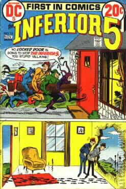 "Conquer Man-Mountain--Because He's There" Four old foes of the Freedom Brigade regroup and magically restore their vitality. The group, Vendetta, then seeks revenge on the children of their former opponents. The Inferior Five is summoned by police to help battle the crooks. They appear to be winning until a grenade created by the Masked Swastika changes glass-jaw boxer Brute Brainard into the Man-Mountain, a green-skinned behemoth. With Man-Mountain's help, Vendetta overcomes the Inferior Five. Then they strike the First National Bank. The Inferior Five recover and engage the crooks again. Merryman strikes a lucky blow to Man-Mountain's jaw and knocks him out. The other heroes then defeat the rest of the gang.