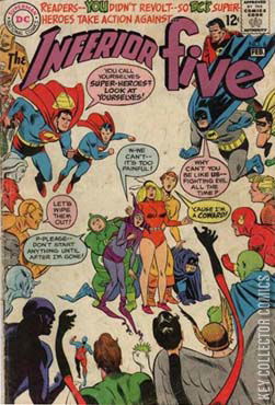 "How To Make A Bomb!" In the offices of National Periodicals, the big boss known as I.D. seeks out Jack Miller the editor of the Inferior Five. I.D. informs Miller that the latest issue of the Inferior Five is due, so Miller corners E. Nelson Bridwell to get him to write the script. Miller and Bridwell then walk through the National office meeting other staffers in an attempt to get them to finish the issue. When they return to Miller's office, a bald villain attacks them. The villain is removed to be used in a better feature. Bridwell finishes his script, while Miller is dragged away to a padded cell. The Inferior Five then falls asleep in Miller's office having missed out on taking part in any sort of adventure.