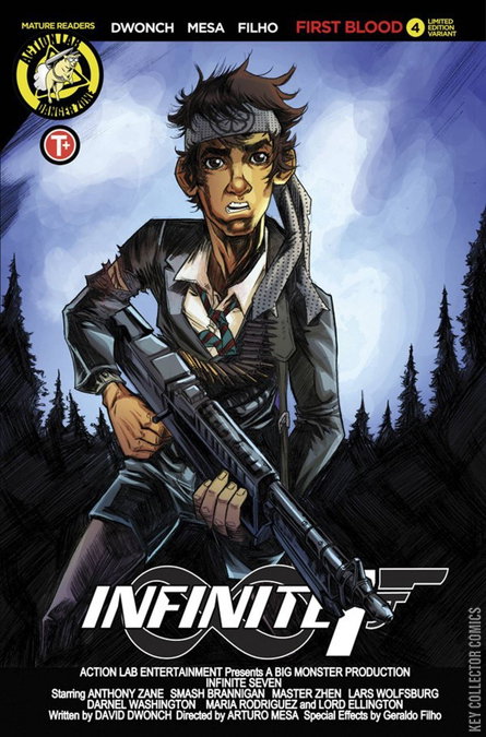 Lines have been drawn and war between the Infinite Seven and Chimera has been declared. The first arc in the hit series comes to an end, but one question remains: Who will draw FIRST BLOOD? This issue is chock full of revelations, and a shock ending that will leave readers reeling! NOTE: Cover D, in addition to the variants from 1-3, completes the MASSIVE Infinite Seven Poster!