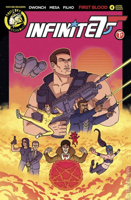 Lines have been drawn and war between the Infinite Seven and Chimera has been declared. The first arc in the hit series comes to an end, but one question remains: Who will draw FIRST BLOOD? This issue is chock full of revelations, and a shock ending that will leave readers reeling! NOTE: Cover D, in addition to the variants from 1-3, completes the MASSIVE Infinite Seven Poster!