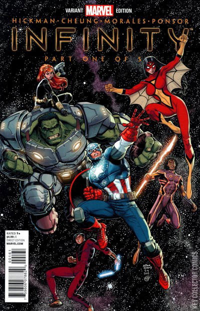 INFINITY, PART 1: INFINITY The over-sized kickoff to the year’s most anticipated Blockbuster summer event, changing the way you view the Marvel Universe! The outbreak of war on two fronts: Earth and Space, with our heroes torn between them. The world-shattering return of Thanos! Includes material from FREE COMIC BOOK DAY: INFINITY Continued in Avengers #18