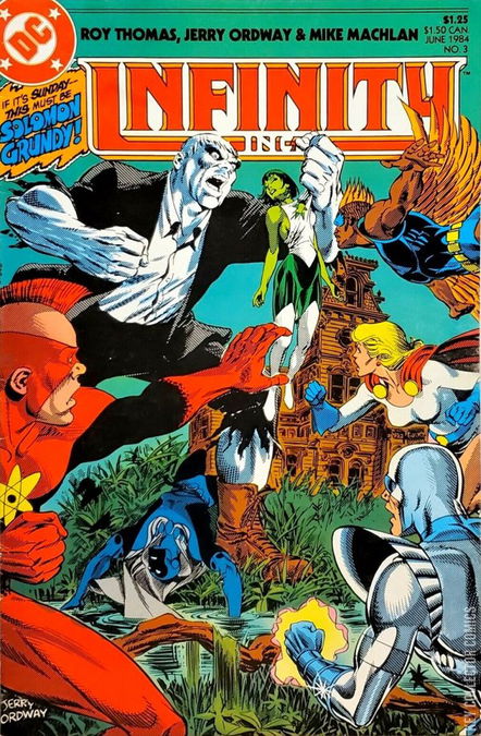 GENERATIONS PART 3 - SOLOMON GRUNDY GOES HOLLYWOOD! The seven lost members of Infinity, Inc. return from 1942, rejoin the others, and set up shop at Stellar Studios, an abandoned movie company owned by the Star-Spangled Kid. Unfortunately, they learn that Solomon Grundy is making the movie lot his home. Meanwhile, several JSA members are immersed in the waters of Koehaha River by an evil Superman.