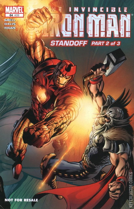The issue opens with Iron Man, the Slokovian army behind him confronting Thor, who is protecting the people of Slokovia, who have come to worship him as a good. Behind him is Balder, and numerous other Asgardian warriors, riding winged steeds with their blade unsheated and looking prepared for battle. Tony attempts to convince Thor that he is making the wrong decision, and his actions with start a fight between the two sides, but Thor tells him to stay out of his godly affairs. Tony retaliates by saying that Thor is not his god, but his friend and he does not want to fight him.The people of Slokovia then come forward and praise Thor, who tells Balder and the others to usher them away from the battle field. Thor turns back to Iron Man, telling him that this is their line in the sand, smashing his hammer and making a large crack that divides his side with the side that Iron Man is on. He warns them not to cross and walks away. As the Slokovian army is ready to fire, Iron Man stops them and tells them that they are not ready yet. As Iron Man flies away, he is contacted by Doctor Doom, who is telling them they should meet.As Iron Man heads to meet with Victor Von Doom, we see a Stark employee watching the news on television about the whole incident. Finally arriving at Doom's castle, him and Iron Man start with some quips at one another, but Doom then expresses his concern about the incident. Doom suggests he uses an armor lined with similar substances as Thor's Asgardian methods, and Tony rebukes this, telling him that if he wants to see a conflict, he'll need to get Pay Per View.We switch back to Thor, who is troubled about the oncoming conflict. Blader, his loyal friend attempts to express his faith in Thor, who thanks him. While he is voicing his troubles, the Stark employee leaves the comfort of his house with a backwards glance at a picture of a young girl. He arrives at his job and is emptying the trash in one of the rooms when Iron Man and Pepper Potts enter the...