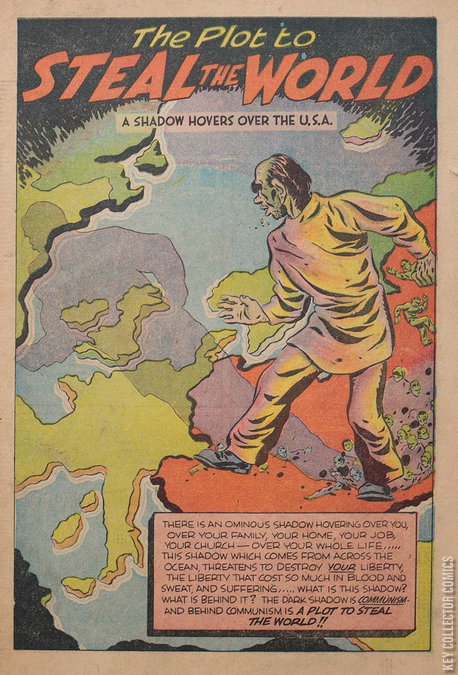 - 16-page anti-Communism promotional giveaway with newsprint cover that warns against communism infiltrating the American workforce