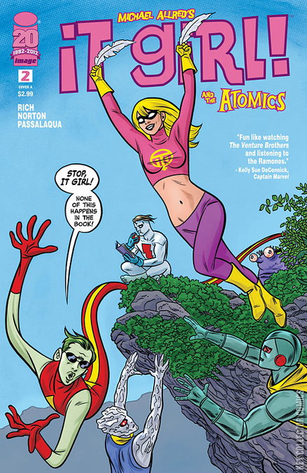 "DARK STREETS, SNAP CITY," Part Two It Girl comes crashing down to Earth. Can she figure out where she's landed before the shadowy figure following behind catches up with her? Also, see what the Skunk's old gang gets up to when left to their own devices! Joins us for world-bending new adventures starring Michael Allred's Atomics!