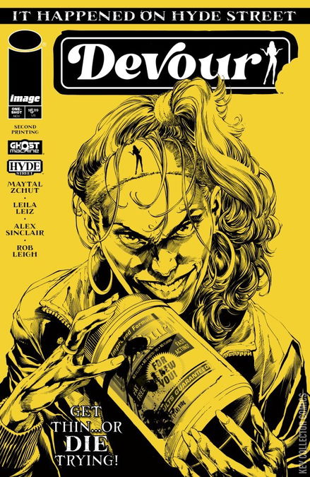Look thin…or die trying!With an impending wedding, Lily needs to lose weight to fit into her wedding dress but struggles to shed some pounds. And what’s worse, her super-thin grandmother relentlessly disparages Lily’s approach, instead lavishing praise upon a quick-fix miracle supplement called DEVOUR, as hawked by the mysterious health guru, MISS GOODBODY. But is taking it worth the cost? In this extra-length one-shot nightmare, when it comes to Devour…all you need is one.