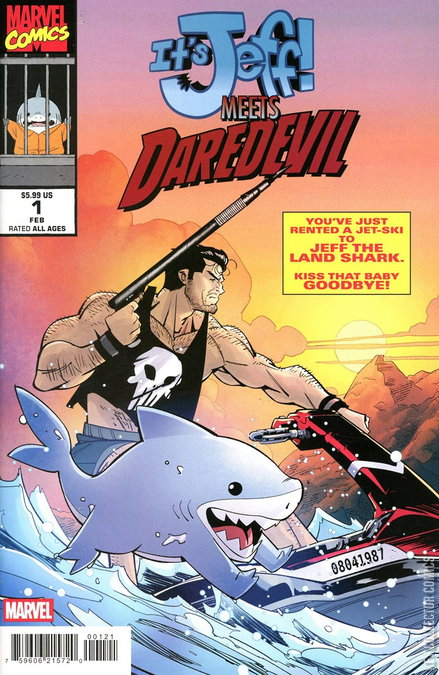 THE ADVENTURES OF JEFF THE LAND SHARK CONTINUE WITH DAREDEVIL! In this special new story from star Jeff team Kelly Thompson and Gurihiru, Jeff the Land Shark learns the meaning of courage from THE MAN WITHOUT FEAR! Plus, the latest season of IT'S JEFF appears in print for the very first time so you can enjoy all the adorableness and chaos the way Daredevil himself would - without a phone screen!!! Don't miss what happens when Jeff wins the lottery, goes to the groomer, and best of all…TAKES ON THE HULK!