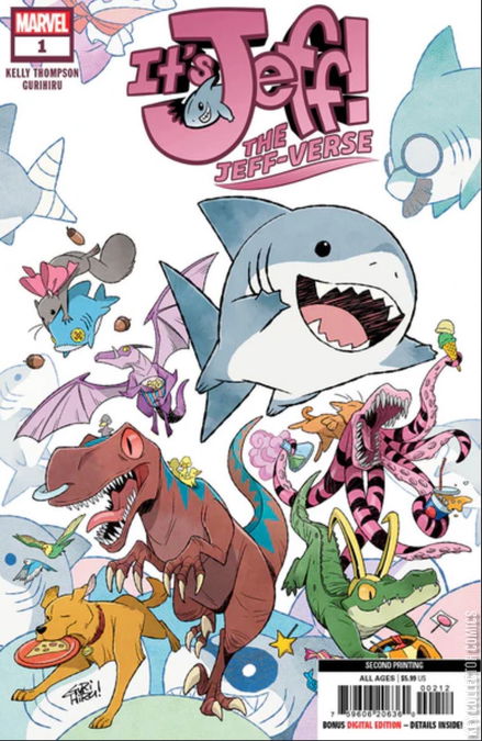 THE DANGEROUSLY ADORABLE JEFF THE LAND SHARK RETURNS! Jeff the Land Shark embarks on another series of madcap adventures with guest spots from some of your favorite heroes! Whether he's orchestrating a pet shop takeover, or solving a high-stakes mystery like 'what's the best street-food snack' (the answer will SHOCK you, True Believer), Jeff is flipping his fantastic fins all over the Marvel Universe! Stealing hearts and cookies with equal impunity! Collecting issues #13-24 of the hit Infinity Comics series from the Marvel Unlimited app, this one-shot features a brand-new cover and never-before-seen story from beloved creators Kelly Thompson and Gurihiru! Kids to Adults