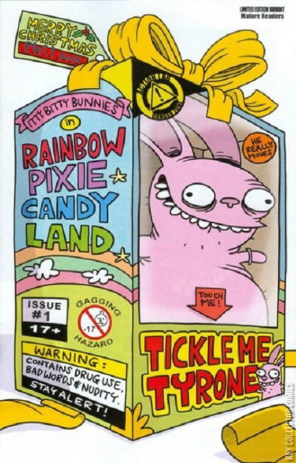 Itty Bitty Bunnies creator and cartoonist extraordinaire Dean Rankine lives down under, where Christmas is celebrated in the summer, so it makes perfect sense for his depraved creations to go on a holiday adventure now stateside. It also makes sense to the Bunnies to cook up a big batch of meth to help fund their Yuletide activities! Also available in a "Tickle Me Tyrone gift" variant cover.