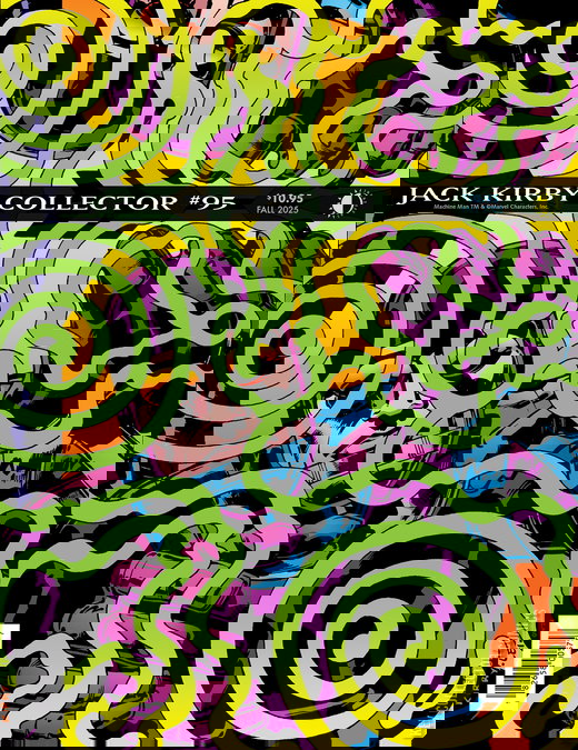 Kirby MADNESS! There's a fine line between genius and insanity, so we'll examine some of Jack's more deranged series and characters, from the Dingbats, Goody Rickels, and Destroyer Duck, to the Goozlebobber, Not Brand Echh, and a mountain of animation concepts too crazy to hit the airwaves! Also included is a 1980s interview with Kirby by James Van Hise, an examination of Jack's psychedelic coloring, Kirby's few (but vital) depictions of Dr. Strange, a far-out Forever People art gallery, Mark Evanier and our other regular columnists, a maniacal 1950s Simon & Kirby story, and more! This off-the-wall issue features an unused Machine Man cover inked by Steve Leialoha.