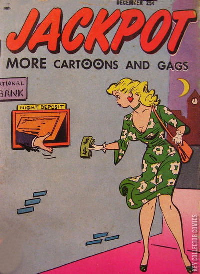 Home / Youthful / Jackpot / Jackpot #1 Youthful Released December 1953 Jackpot #1 Add to Collection Want It Synopsis No synopsis available. Issue 1 of 5 Add to Collection Buy it on eBay Buy on eBay Low $25 Mid $75 High $250 Synopsis No synopsis available. Details Series Jackpot Cover Date December 1953 Pages N/A UPC N/A Cover Price $0.25 Final Order Cutoff N/A Creators No creators listed. Price Guide Log in or subscribe to access detailed graded price information and market insights. Log In Subscribe
