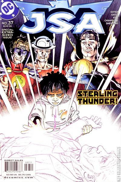 STEALING THUNDER, PART 5 OF 5: CROSSING OVER / DEATH DUTY An extra-sized issue features the dramatic conclusion to the 5-part "Stealing Thunder!" Johnny Thunder has caught the wrong end of a Marvel-ous fury, and the world must cope with the repercussions of Ultra-Humanite's mad dream. The JSA learns the hard way that to stop the Ultra-Humanite, the ultimate price must be paid. PLUS: An 8-page backup story starring the new Crimson Avenger, drawn by Peter Snejbjerg (STARMAN)!