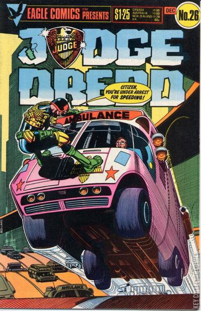 The original US reprint series from Eagle Comics reprinting the best Judge Dredd stories from UK anthology comic 2000AD.Cover: Brian Bolland (Judge Dredd)City Block (progs 117-118) (John Wagner - Ron Smith)A Tale from Walt's Scwapbook (progs 119 and 121) (John Wagner - Ron Smith)Mega-Way Madness (prog 189) (Alan Grant - Ron Smith)