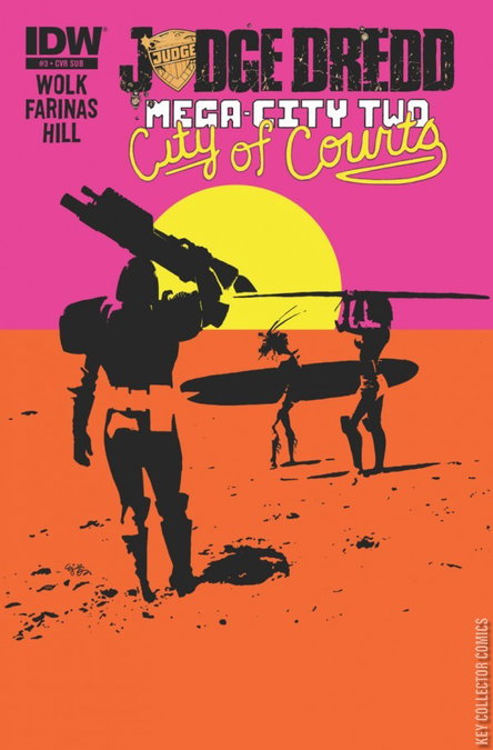 The Law on the beach! The cameras are on Dredd as he patrols the coastline of Mega-City Two, but what happens when disaster strikes at an immigration checkpoint's Citizenship Pageant? And what about the enormous man-eating shrimp that's terrorizing what used to be the California waterfront?
