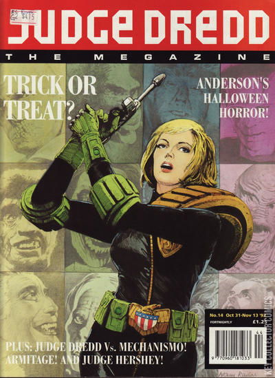 New Judge Hershey series starts this issue.Cover: Arthur Ranson (Judge Anderson)Judge Dredd - Mechanismo (part 3) (John Wagner - Colin Macneil)Judge Hershey - Deathsquads (part 1) (Peter Cornwall - Yan Shimony)Armitage - Influential Circles (part 5) (Dave Stone - Charlie Adlard)Judge Anderson - The Witch? Report (Alan Grant - Arthur Ranson)