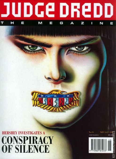 Cover: Mark Wilkinson (Judge Hershey - after Silence of the Lambs)Judge Dredd - Mechanismo (part 4) (John Wagner - Colin Macneil)Judge Hershey - Deathsquads (part 2) (Peter Cornwall - Yan Shimony)Armitage - Influential Circles (part 6) (Dave Stone - Charlie Adlard)Tea with Mrs Gunderson (John Wagner - Dean Ormston)