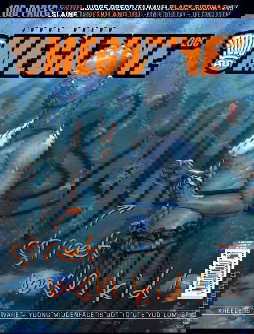 Cover: Mark Harrison (Young Middenface)Judge Dredd - Monkey on my Back (part 2) (Garth Ennis - John Higgins)Apocalypse Soon (part 2) (Alan Grant - Shaun Thomas)Young Middenface - Mutopia (part 1) (Alan Grant - John Ridgway)Black Siddha - Bad Karma (part 4) (Pat Mills - Simon Davis)The Interrogation Cube (subject 005) - John Ridgway (interview)Thrill-Power Overload! The History of the Galaxy's Greatest Comic (part 15 - final part) (David Bishop)Family (part 5) (Rob Williams - Simon Fraser)Devlin Waugh - Red Tide (part 4) (John Smith - Colin Macneil)2000ad Gold Supplement 005Cover: Mike Western (Darkie's Mob)Daily Star Dredd - 274 (John Wagner and Alan Grant - Ian Gibson)Darkie's Mob (parts 13-16) (reprint from Battle - originally published 6 to 27 November 1976) (John Wagner - Mike Western)Hall of Heroes - Tyranny Rex (art: Paul Marshall)Slaine - Time Killer (parts 11-14) (reprint from 2000ad progs 421-424) (Pat Mills - David Pugh and Glenn Fabry)