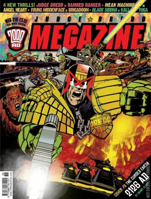 Two covers: both by Henry Flint (Judge Dredd)Judge Dredd - Damned Ranger (part 1) (John Wagner - John Ridgway)The Interrogation Cube (subject 012) - Simon Davis (interview)Young Middenface - Brigadoom (part 1) (Alan Grant - Patrick Goddard and Dylan Teague)Mean Machine - Angel Heart (part 1) (John Wagner - David Millgate)Whatever Happened to Conrad Conn? (Gordon Rennie - Carlos Trigo)Black Siddha - Kali Yuga (part 1) (Pat Mills - Simon Davis)The Dredd Files (part 5) (David Bishop)Charley's War (parts 29-32) (reprint from Battle - originally published 21 July to 12 August 1979) (Pat Mills - Joe Colquhoun)HellTrekkers (parts 1-6) (reprint from 2000ad 387-392) (John Wagner and Alan Grant (writing under the name 'F.Martin Candor') - Jose Ortiz and Horatio Lalia)Judge Dredd - Mutie Menace (Gordon Rennie - Inaki Miranda) (reprint from the Daily Metro)