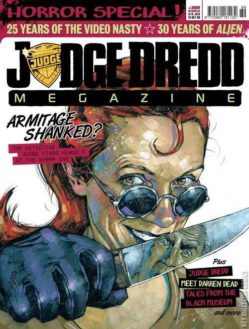 Cover: Simon Davis (Armitage)Judge Dredd - Snakebite (part 1) (Robbie Morrison - Kev Walker)Interview - Ron Smith (part 2)Tales from the Black Museum - The Shadow over James Block (Arthur Wyatt - Tiernen Trevallion)Meet Darren Dead - Eats, Shoots & Kills (part 3 - final part) (Rob Williams - John Higgins)Armitage - The Mancunian Candidate (part 4) (Dave Stone - John Cooper) + this issues bagged comic is: Graphic Novel 15: Armitage - Influential Circles (volume 01) - Armitage - Influential Circles (reprint from the Judge Dredd Megazine (volume two) issues 10-15) (Dave Stone - Charlie Adlard)Hershey and Steel - Degenomancer (reprint from the Judge Dredd megazine (volume two) issues 35-36) (Dave Stone - Charlie Adlard)