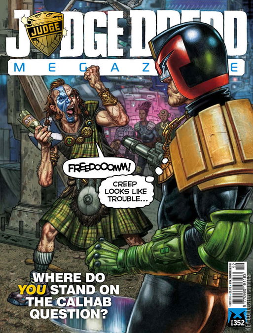 Cry freeeeeeedom!! As Scotland goes to the polls to decide on its fate, the Judge Dredd Megazine brings up a brand new collection of tales from the Scotland of the future – Cal-Hab! This special bundle of tales tops a bumper issue with more from John Wagner and Henry Flint on "Judge Dredd: Dead Zone", Dan Abnett and Phil Winslade on "Lawless", and Arthur Wyatt and Paul Davidson’s follow-up to the sell-out comic book sequel to the DREDD movie! Plus The Man From The Ministry continues and we have interviews with John Layman and Eddie Robson, plus a special bonus GN featuring Steve Moore’s boisterous Valkyries!Cover: Glenn FabryJudge Dredd - Dead Zone Part Three (John Wagner - Henry Flint)Lawless - Welcome To Badrock Part Three (Dan Abnett - Phil Winslade)Interview - John LaymanDredd - Uprise Part Three (Arthur Wyatt - Paul Davidson) + this issues bagged comic is: Graphic Novel 78: Calhab Justice - (Jim Alexander - John Ridgway)Dounreay (Jim Alexander - LOL)Casualty (Jim Alexander - LOL)