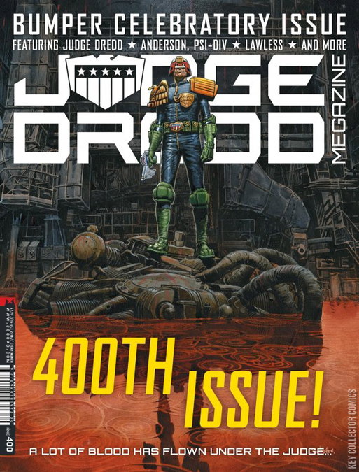 More action and adventure in the future-shocked world of Judge Dredd! The Megazine marks an incredible milestone as it reaches its 400th issue by celebrating with a bumper 100-page special edition. Inside, you'll find royal shenanigans in Judge Dredd: The Trouble with Harry; a restaurant robbery in Anderson, Psi-Division: Jordan Ramzy's Kitchen Nightmare; a housing-estate exorcism in Devlin Waugh: Call Me By Thy Name; plus new series for Lawless, and Blunt; the Dark Judges return in "The Torture Garden"; and Storm Warning's back in "Over My Dead Body." Plus interviews, features and more. + this issues bagged comic is: a classic SF thriller from the pages of Starlord: the first part of Mind Wars by Alan Hebden and Jesus Redondo!
