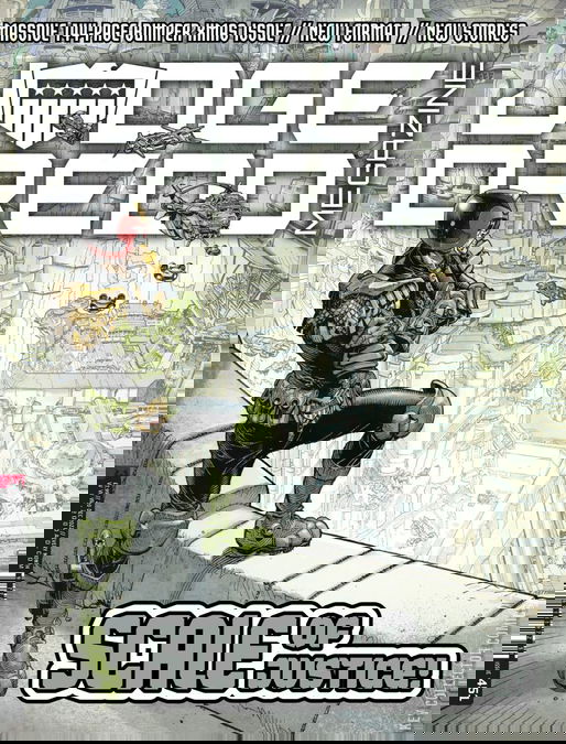 More action and adventure in the future-shocked world of Judge Dredd! The lawman deals with troublemakers in the Cursed Earth in the final part of "Babel"; Judge Death is given a new lease of life courtesy of a heavy metal band in "Death Metal Planet"; Zane Perks starts his dangerous mission in Surfer Book Two; Devlin Waugh continues to mine his past in "Karma Police"; and Psi-Judge Lillian Storm crosses the underworld in "Dead and Gone". + this issues bagged comic is: this month we showcase the art of Thor: Love and Thunder storyboard artist Mark Sexton, collecting two Judge Dredd stories by him and Mike Carroll!