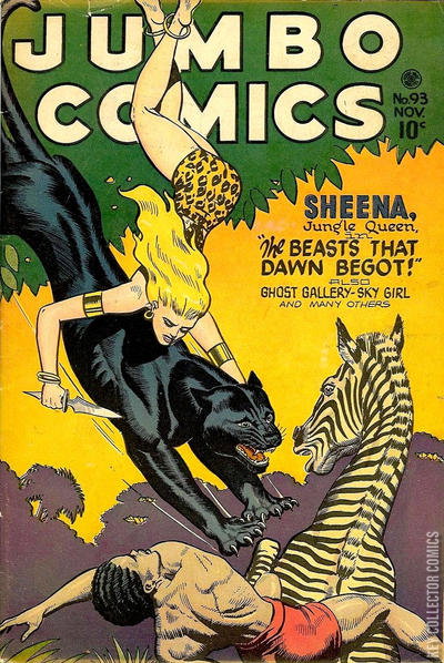 In order of appearance: "Sheena, Queen of the Jungle" art by Robert Webb, reprinted in Sheena Queen of the Jungle (1942 Fiction House) #12 and Golden Age Sheena Best of Queen of the Jungle TPB (2008) #1-1ST; "ZX-5" art by Jack Kamen; "Patsy Pinup"; "The Hawk" art by Robert Webb; "Sky Girl" art by Matt Baker, reprinted in Sky Gal (1994) #2; "Hateful Herman"; and "Stuart Taylor in Weird Stories of the Supernatural" and "The Ghost Gallery" art by Jack Kamen. "Sheena and the Howling Horror" text story. 52 pages. Full color.